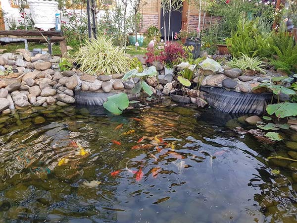 Mỗi sáng mở cửa sổ, vợ chồng anh Tạo và con gái nhỏ thấy hoa hồng nở rộ, cá chép bơi lội tung tăng trong hồ.