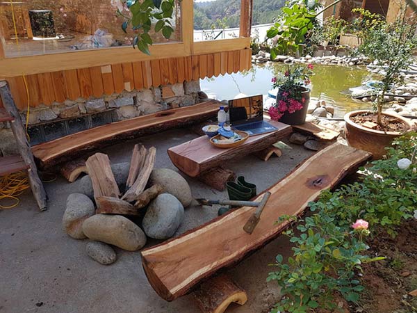 Dù chi phí làm nhà gỗ không hề rẻ nhưng ông bố trẻ vẫn quyết tâm mở rộng nơi ở của mình. Anh chăm chút cho từng chi tiết trong khu nhà vườn như bàn ghế uống trà ngoài vườn làm từ các thân gỗ mộc.