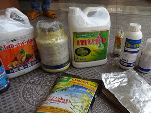 Ngoài ra, cơ quan chức năng phát hiện và tạm giữ tại hiện trường một xô chứa dung dịch nước màu vàng, gần 20 chai hóa chất in nhiều loại chữ nước ngoài, 14 bịch bột màu không nhãn hiệu; 7 can nhựa in nhiều loại chữ nước ngoài; 2 bịch kích thích sinh trưởng hiệu Lunar 150WP dùng để phun trên lá sầu riêng; 851 thùng sầu riêng đã bôi, nhúng dung dịch màu vàng có trọng lượng khoảng 14 tấn.