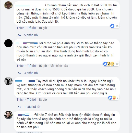 "Như ông xích lô nói thấy khách sộp nên hét giá, thế thì ông Tây kia đã sộp từ mua đồ ở cửa hàng tới đi xích lô thì họ dựng chuyện này để làm gì? Chưa kể việc đi Grab 7 chỗ chỉ tốn 30.000 đồng mà anh hét 600.000 đồng thì cho thấy lòng tham của anh cũng không phải là nhỏ, vậy việc lừa đảo tráo tiền khả năng anh làm rất là cao", tài khoản Lưu Dũng bình luận.