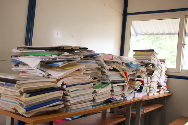Chồng sách vở cao dày của các chiến sĩ sau mùa thi cử.