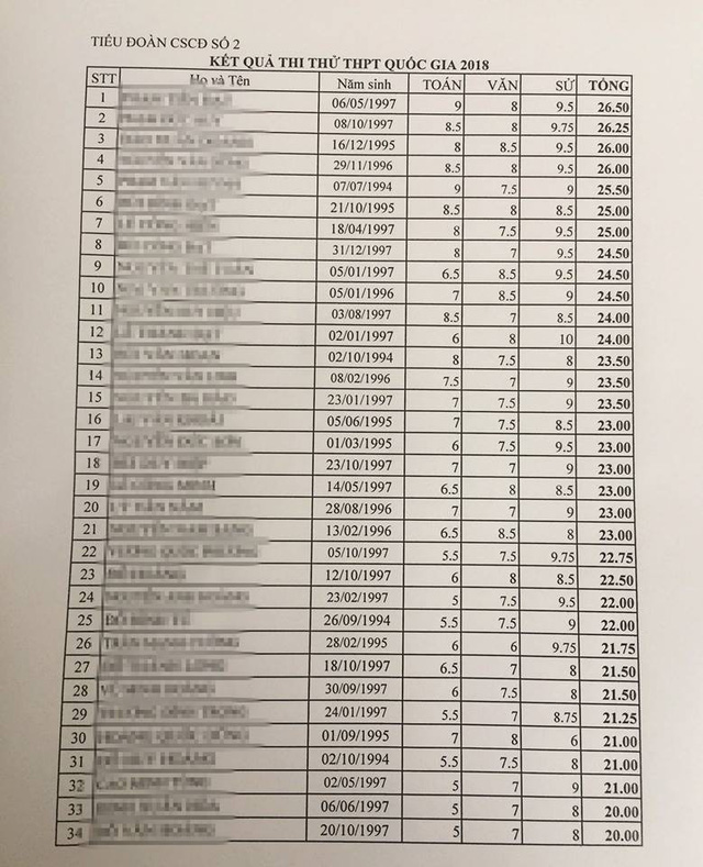 - Năm nay, đơn vị có 112 chiến sĩ tham dự kì thi THPT Quốc gia. Điểm thi như vậy không có gì là cao. Điểm các bạn nhìn trong danh sách là đã cộng điểm ưu tiên, còn cột điểm thực thì không đến thế (cao nhất chỉ đạt hơn 25 điểm). 112 chiến sĩ mới có một người như thế, các chiến sĩ phía sau danh sách 35 người đang được lan truyền có điểm thấp hơn khá nhiều.