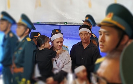 Cậu con trai nhỏ của anh mới 3 tuổi cứ khóc ré lên khi người mẹ quàng lên đầu cậu vành khăn tang trắng. Ánh mắt cậu bé ngơ ngác hết nhìn di ảnh cha, lại nhìn những người đồng đội đang tổ chức tang lễ cho cha cậu. Kế bên, cô con gái 4 tuổi trên tay người mẹ cũng ngơ ngác, hoảng hốt ngó quanh nơi đặt di cốt của cha. Hai đứa trẻ dường như còn quá nhỏ để cảm nhận được nỗi mất mát lớn lao này