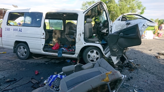 Xe khách 15 chỗ BKS 75B 00052 (chở 17 người trên đường vào Bình Định dự đám cưới) đã tông trực diện xe container BKS 51D 411.21 kéo theo rơ móc BKS 51R 215.75. 13 người tử nạn tại chỗ, 4 người đang cấp cứu trong tình trạng nguy kịch.
