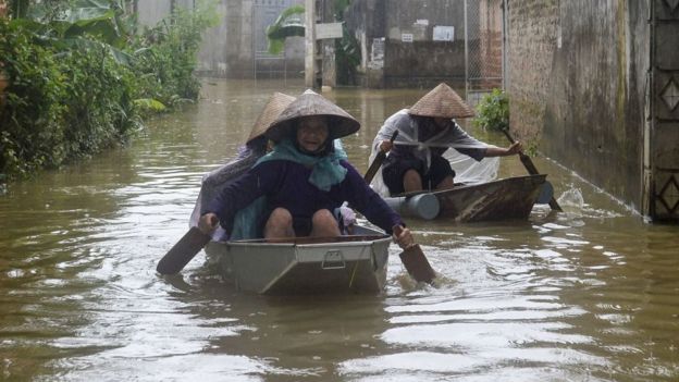Hinh ảnh trên truyền thông Việt Nam cho thấy người dân huyện Chương Mỹ đi thuyền trên các ngõ phố.