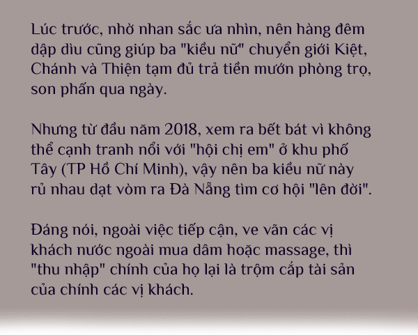 Theo cơ quan CSĐT Công an TP Đà Nẵng thông tin: Loại tội phạm nam giả nữ, chuyển giới chỉ mới xuất hiện ở Đà Nẵng trong thời gian gần đây. Chúng chủ yếu từ các tỉnh thành miền Nam ra "ăn bay" theo đợt.