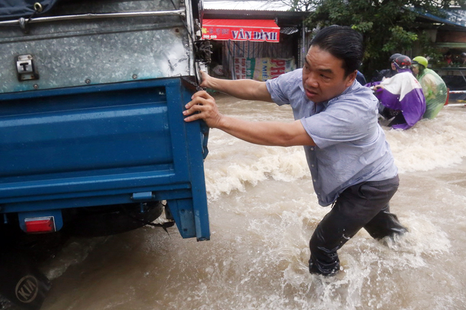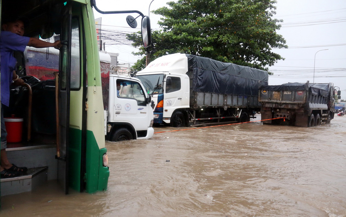 Nước dâng lên tới cửa xe buýt, trong khi nhiều ôtô tải khác chết máy hàng loạt.