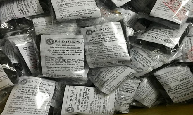 Ngoài túi có in nhãn hiệu “Bà Đại gia truyền viên tiểu đường” và ghi công dụng “giúp người tiểu đường khỏe mạnh, minh mẫn và đắc thọ. Chống các biến chứng, đau nhức, tê mỏi và lung lay răng” kèm theo hướng dẫn sử dụng.