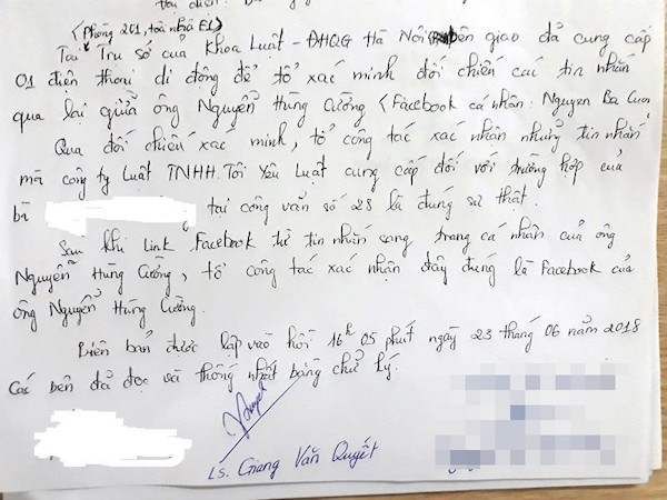Biên bản làm việc giữa tổ xác minh vụ việc và luật sư Giang Văn Quyết. Ảnh: NVCC.