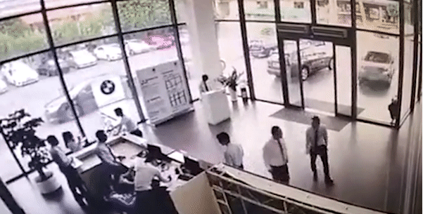 Video trích xuất từ camera an ninh của đại lý BMW Quảng Châu cho thấy, nữ tài xế điều khiển chiếc SUV xanh dương chồm lên vỉa hè, tiến thẳng vào cửa đại lý.