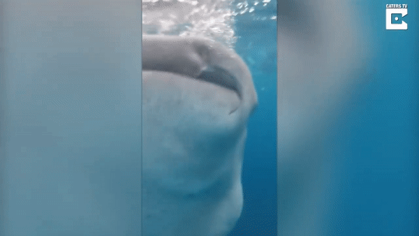 Cá mập voi há to miệng, hút hàng khối nước xung quanh, khiến vị khách đang lặn gần đó cũng bị hút theo