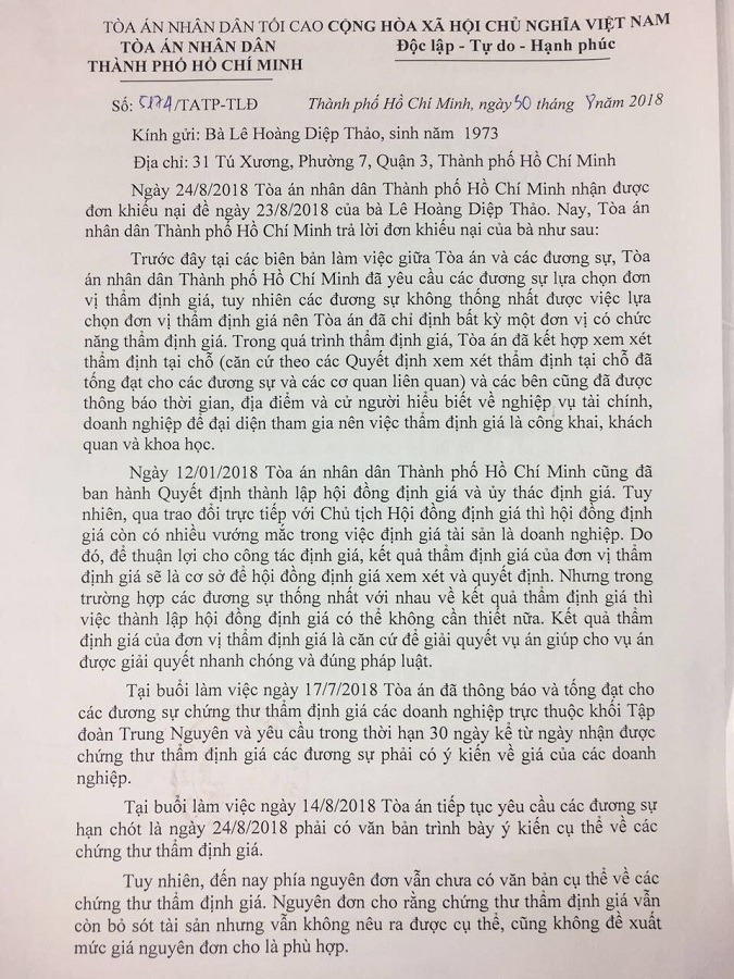 Thư trả lời của Thẩm phán Nguyễn Văn Xuân khiến bà Thảo bức xúc vì chưa tới hạn để bà đưa ra ý kiến vầ tài sản của Trung Nguyên