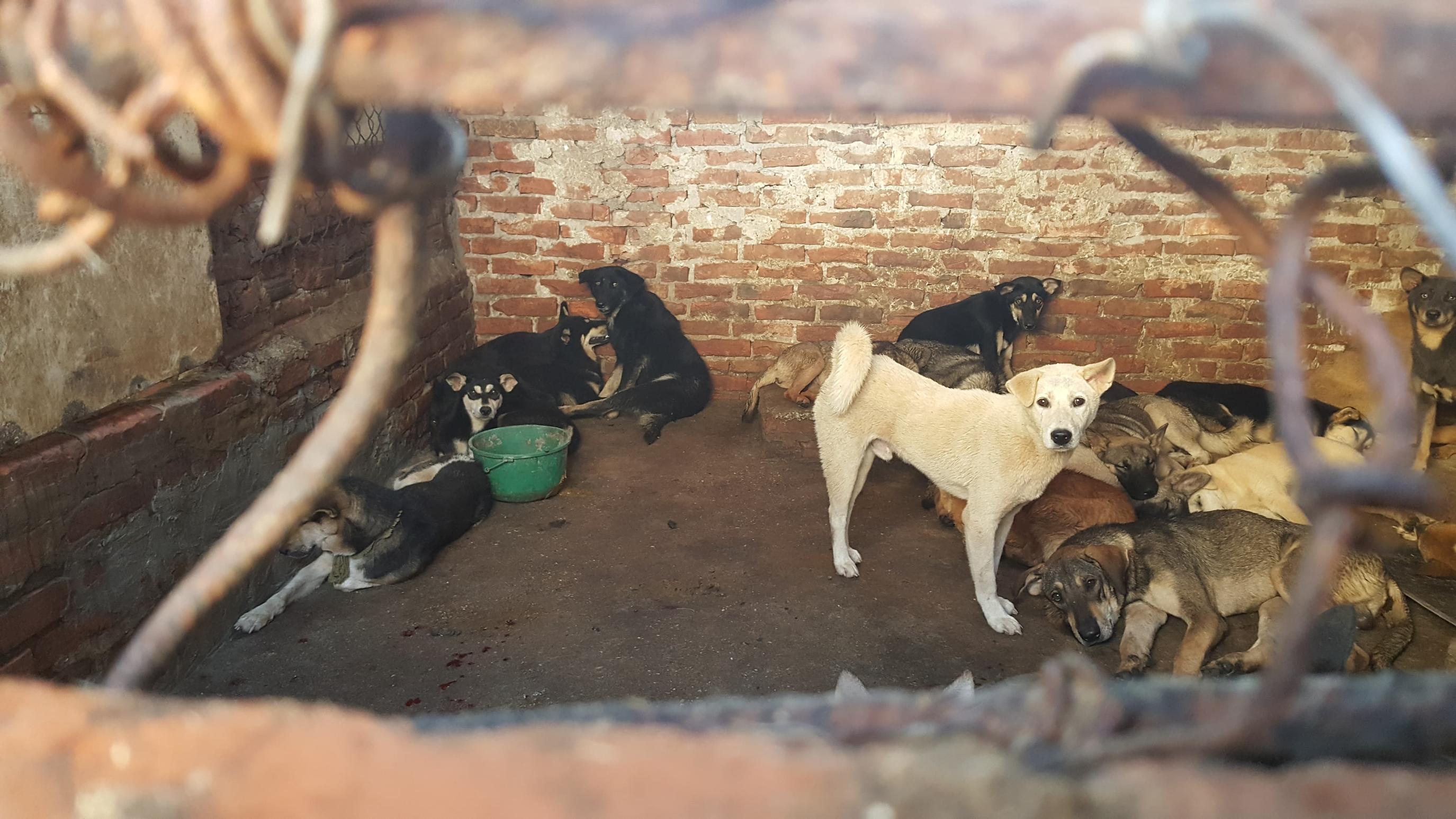 Chó sau khi thu gom về được nhốt trong chuồng chờ ngày giết thịt. Ảnh: Diệu Bình