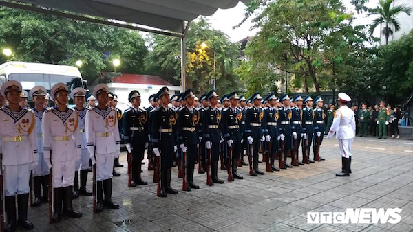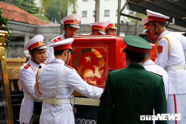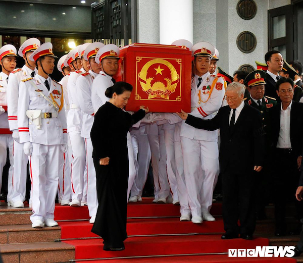 Tổng Bí thư Nguyễn Phú Trọng cùng Chủ tịch Quốc hội Nguyễn Thị Kim Ngân cùng đội nghi thức thực hiện di quan linh cữu cố Chủ tịch nước Trần Đại Quang.