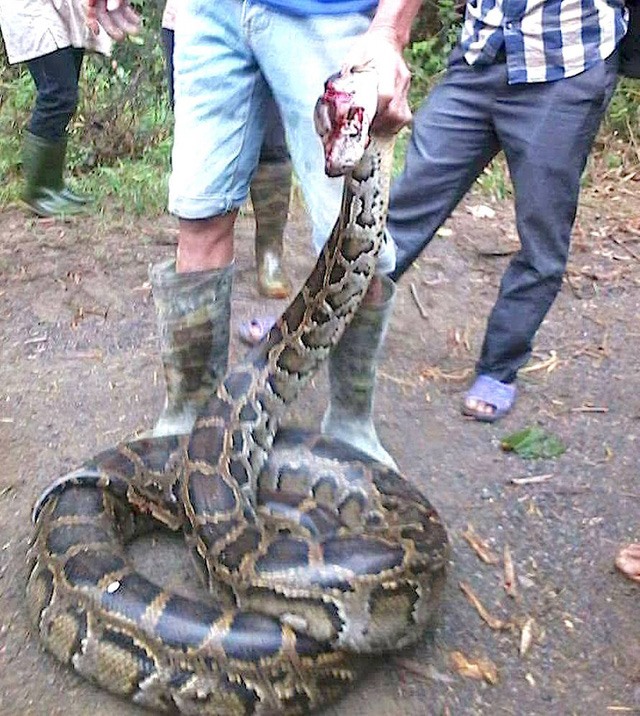 Con trăn quá to và sợ trăn hung dữ nên người dân đã đập chết con trăn này rồi mang về nhà. Được biết, con trăn này dài hơn 5m, nặng khoảng 30kg.