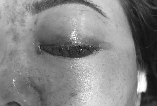 Chỉ 5 phút sau khi được kỹ thuật viên chích chất làm đầy vào mũi, bệnh nhân bắt đầu bị sưng phù mặt, sụp mí mắt, da vùng mũi và trán có vết bầm ngày càng lan rộng. Nghĩ là phản ứng bình thường của cơ thể, chị D. về nhà nghỉ ngơi. Tuy nhiên, tình trạng sức khỏe của chị ngày càng xấu, thị lực mắt trái giảm dần, mặt sưng phù.