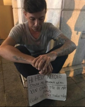 Mạng xã hội đang lan truyền nhiều video ghi cảnh một nam thanh niên đứng xin tiền trên đường phố Sài Gòn. Trong video, thanh niên ngoại quốc trông khỏe mạnh, ăn mặc bảnh bao đứng trên lề đường. Anh ta cầm tấm bảng được ghi bằng tiếng Việt với nội dung đi du lịch bị mất ví, giấy tờ nên cần xin một chút tiền và mong mọi người giúp đỡ. Ngay lập tức, một người đàn ông trung niên ngoại quốc khác tiến tới xé tấm bảng và mắng anh này xối xả.