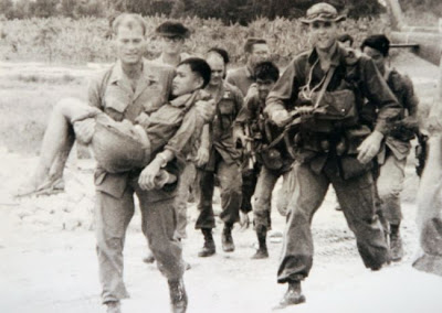 Tiếng trực thăng H-34 nghe phành phạch từ xa. FAC đảo thật thấp trên đầu chúng tôi. Trực thăng vơ trang cũng vừa tới, tuôn đại liên và rocket chung quanh băi đáp. Thằng James và tụi thằng Cầu, thằng Sáng nhào ra tới các thân cây đă quấn giây chuyền nổ sẵn để giựt kíp nổ. “Ầm – Ầm – Ầm”. Năm sáu cây ào ào ngă xuống. Theo tiêu lệnh, 2 tù binh và bán tổ của toán lên trực thăng đầu tiên. Nhóm của tôi và thằng Meadows luôn luôn xuống trực thăng trước và lên trực thăng sau cùng. Thằng Nghĩa đáp xuống, tḥ đầu ra cửa sổ đưa tay vẫy tôi và đưa một ngón tay cái lên. Tôi cười và vẫy tay ra dấu đáp lại. Cây cối ngă ngổn ngang nhưng nó đáp xuống cũng đẹp lắm. Bánh xe trực thăng đặt gần chạm đất, do đó tụi tôi đỡ 2 tù binh bị trói tay bước lên bậc thang trực thăng cũng dễ. Trực thăng của thằng Nghĩa vừa kéo lên khỏi ngọn cây th́ chiếc kia của thằng Hiếu cũng đáp xuống liền trong tích tắc.