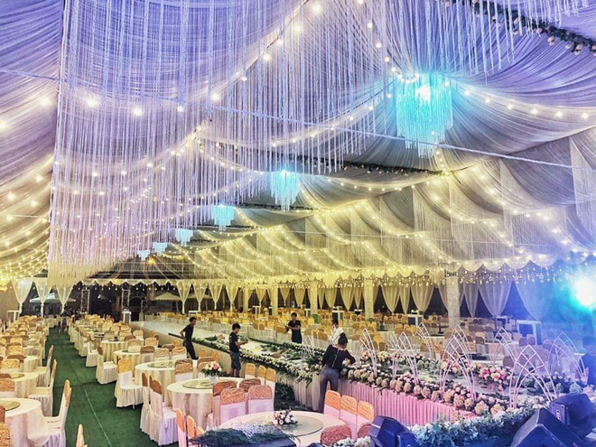 Không gian tiệc cưới sang trọng và lộng lẫy được dựng lên tại khu đất trống rộng lớn