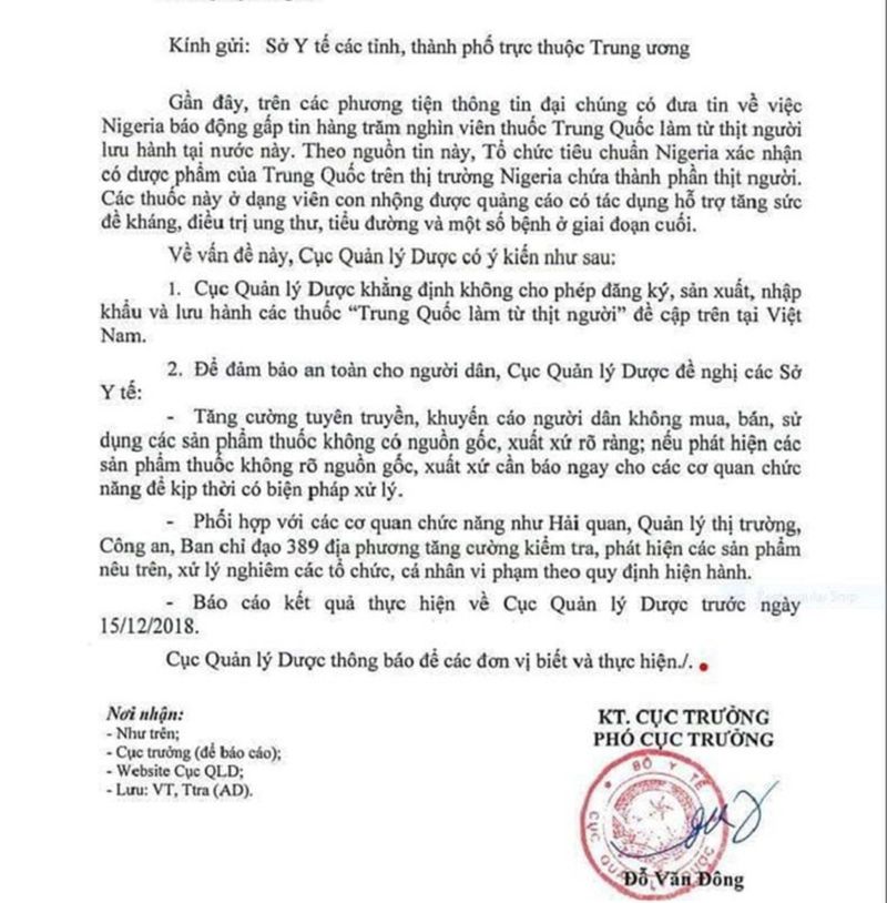 Công văn của Cục Quản Lý Dược về vụ “thuốc Trung Quốc làm từ thịt người.” (Hình: Pháp Luật TP.HCM)