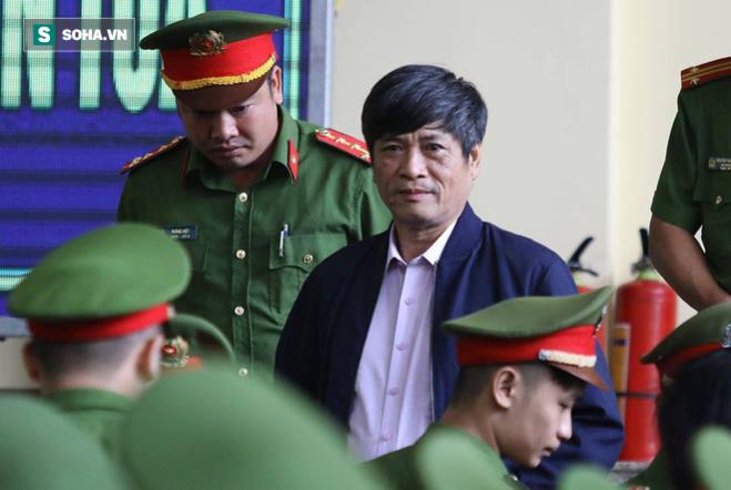 Cựu trung tướng cảnh sát mặc áo khoác xanh tím than, sơmi xanh, đi giày đen, đi lại với dáng vẻ nhanh nhẹn. Bị cáo quê Nam Định được yêu cầu ngồi ở dãy ghế đầu. Hai bên ông đều có cảnh sát.