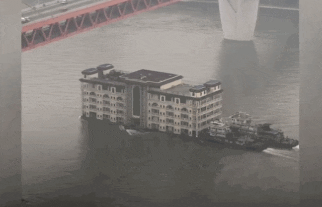 Theo Shanghaiist, mới đây cư dân ở Trùng Khánh đã có một phen hoảng hồn khi nhìn thấy một tòa nhà 5 tầng trôi lơ lửng trên sông Dương Tử. Bên dưới là hai con tàu cỡ lớn hỗ trợ di chuyển