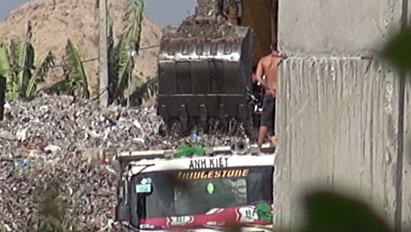 Khoảng 16h ngày 12-8, tại một bãi rác khổng lồ, lộ thiên ven đường Nguyễn Hữu Thọ (xã Long Thới, huyện Nhà Bè, TP.HCM), xe ben 10 tấn mang biển số 51D-310... đang được máy xúc múc từng gầu rác thải đổ lên thùng xe.