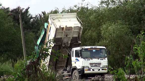 Việc chôn lấp rác thải ớ đây diễn ra liên tục trong nhiều ngày. Trong những ngày có mặt tại hai điểm xuất phát và đích đến, chúng tôi ghi nhận hàng loạt xe ben có trọng tải tương tự, mang biển số: 51C-996..., 51D-315..., 51D-313... liên tục chở chất thải từ bãi rác tại xã Long Thới, huyện Nhà Bè tới điểm san lấp tại xã Phong Phú, huyện Bình Chánh.