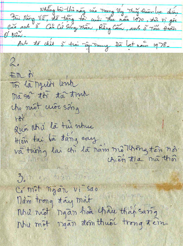 - Máy bay đáp xuống là chị phải chạy ngay vào giao thông hào bên cạnh, kiếm một chiếc nón sắt đội lên đầu cho chắc ăn rồi mới di chuyển vào trong doanh trại. Tôi hồi hộp chờ đợi, và có cảm tưởng những khẩu pháo của Việt Cộng đang im lặng như một cái bẫy chờ đợi con mồi... Nhưng khi trực thăng vừa đáp xuống, tôi thấy người đón tôi vẫn chiếc mũ lưỡi trai trên đầu và điếu thuốc cố hữu trên môi, đứng dựa lưng vào xe Jeep, rất thản nhiên, cái thản nhiên của những người đã quen sống trong vùng lửa đạn.