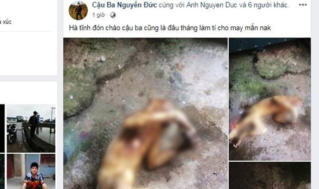Ngày 1-12, trên tài khoản Facebook cá nhân Cậu Ba Nguyễn Đức ở Hà Tĩnh đăng tải một dòng trạng thái: ''Hà Tĩnh đón chào cậu ba cũng là đầu tháng làm tí cho may mắn''. Đính kèm dòng trạng thái là 3 bức ảnh chụp một con khỉ đã bị giết, cạo lông, thui cháy sém.