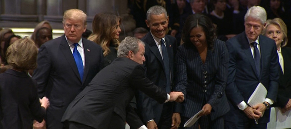 Khoảnh khắc gây chú ý của cựu Tổng thống Bush “con” trong tang lễ cha với cựu phu nhân Mỹ Obama