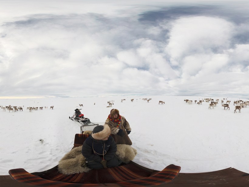 Chăn gia súc trên cao nguyên Karasjok. Những người chăn gia súc băng qua tuyết trên cao nguyên bên ngoài Karasjok, Na Uy. Đây là công việc thường ngày của họ, cưỡi trên xe tuyết và chăm sóc đàn gia súc là những con tuần lộc đông đúc.