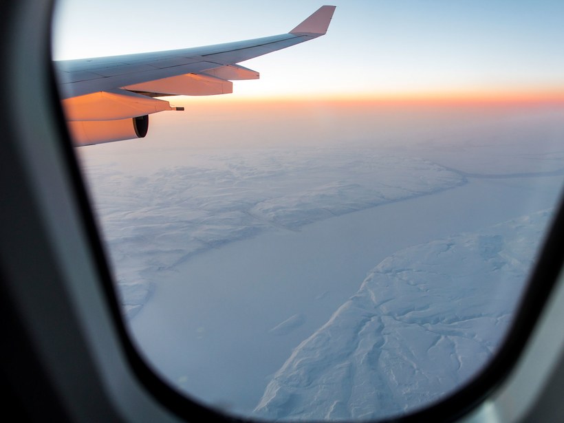 Chân trời băng giá. Một ánh sáng mềm mại của màu đỏ và màu cam dường như chạm vào cánh của hãng hàng không này khi nó lướt trên địa hình màu xanh xám của Bắc Cực. Quang cảnh thật sự rất đẹp.