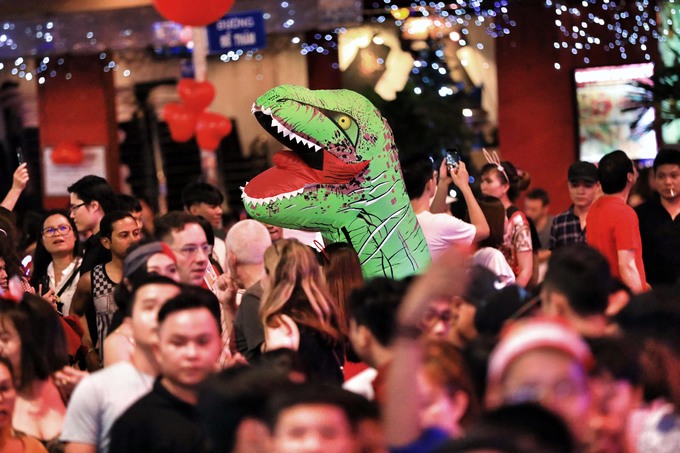 Ngoài ông già Noel, nhiều quán ăn thu hút khách bằng con khủng long khổng lồ.