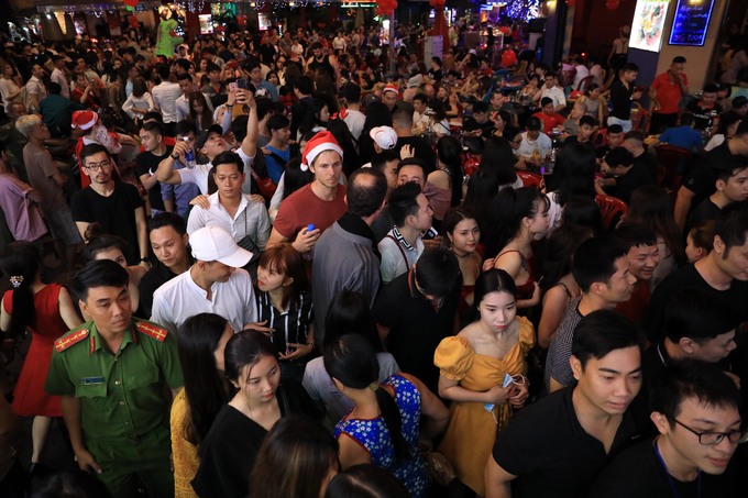 Tối 24/12, phố Tây Bùi Viện (quận 1, TP HCM) ken đặc người đổ về vui chơi Noel. Mọi người phải nhích từng chút một trên con phố dài hơn 700 m.