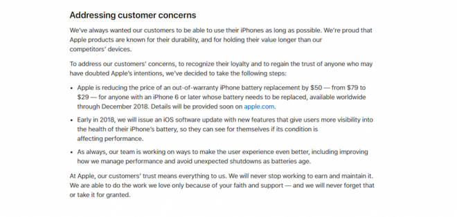 Chính vì vậy mà khi Apple công bố bí mật này, đã có rất nhiều người dùng tỏ ra giận dữ và phản đối. Trước làn sóng tức giận từ phía khách hàng, Apple đã phải xin lỗi và giảm giá dịch vụ thay pin mới cho iPhone từ 79 USD xuống còn 29 USD.