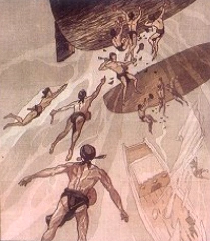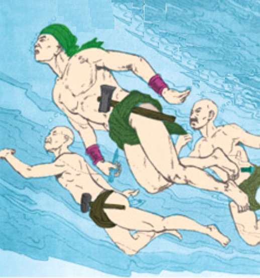 “Khi ấy giặc Bắc cưỡi mấy trăm chiếc thuyền vượt biển tới cửa Vạn Ninh, người trong nước rất sợ hăi, t́m kẻ có thể đánh lui giặc Bắc ở khắp trong ngoài để phong thưởng. Dị nhân bèn lặn vào trong biển, đến dưới thuyền dùng sắt nhọn mà đục, thuyền vỡ bị nước đánh ch́m. Giặc Bắc sợ hăi không hiểu tại sao bèn lấy thủy tinh soi, từ cao nh́n xuống đáy biển thấy có người ngắm đục ở bên cạnh thuyền vội bủa lưới thép để bắt. Dị nhân bèn bị bắt sống. Giặc cởi trói rồi hỏi: Nước Nam có bao nhiêu đứa giỏi như mày? Đáp: Kẻ giỏi như ta rất nhiều, hiện nay đang ở dưới bể đục thuyền. Ta chẳng may bị bắt, Thượng quốc nếu dùng đến ta, ta sẽ dẫn đến chỗ bọn họ, thả sức mà bắt. Giặc Bắc tin lời sai đem thuyền nhẹ để đi. Dị nhân thừa cơ lúc sơ hở nhảy xuống nước trốn mất. Bọn giặc trong thuyền nh́n nhau không biết làm thế nào.