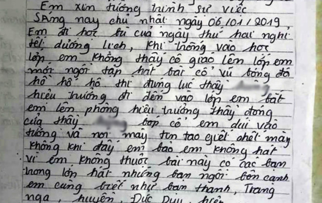 “Trong giờ học, do các cháu hát gây ồn ào nên thầy hiệu trưởng gọi lên phòng nhắc nhở, còn việc có bóp cổ hay không thì phải làm rõ. Ban đầu, làm việc với chúng tôi, thầy Hùng cam kết là không có việc bóp cổ, dọa nạt cháu. Nhưng hiện tại gia đình học sinh có đơn nên công an phường và chúng tôi đang tiếp tục làm rõ” – ông Kiên nói.