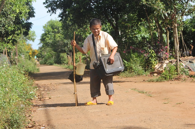 Gần 10 năm nay, đôi chân nhỏ của anh Minh còn phải làm thêm nhiệm vụ chỉ đường, để anh có thể lên thành phố ăn xin kiếm tiền ăn và chữa bệnh cho mẹ. Bắt đầu từ 6h sáng, ngày nào cũng vậy, anh khoác chiếc túi nhỏ mò mẫm ra quốc lộ để bắt xe, tìm đường lên thành phố và khi ánh đèn đường bắt đầu thắp sáng cũng là lúc anh trở về quây quần bên mâm cơm đạm bạc với mẹ.