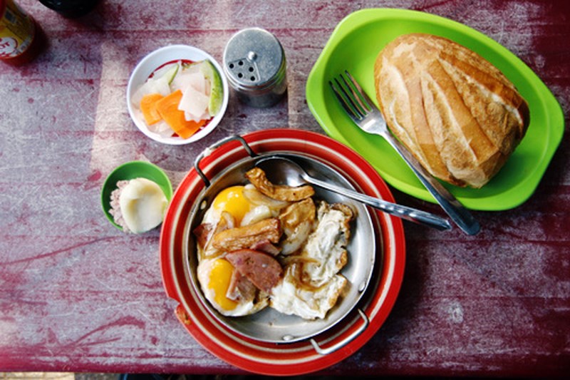 Thực khách luôn thích thú với chiếc chảo nhỏ ngút khói dọn ra bắt mắt cùng màu vàng của trứng, màu nâu của miếng thịt nguội, chả cá. Bên cạnh đó là chén đồ chua tươi mát kèm thêm ổ bánh mì giòn làm cho món ăn càng thêm hấp dẫn.