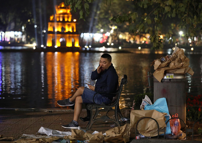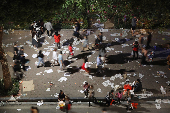 Nhiều đống rác chất cao quá đầu người. 1h30 công nhân môi trường bắt đầu quét dọn khi người dân đã di chuyển khỏi khu vực hồ Hoàn Kiếm.