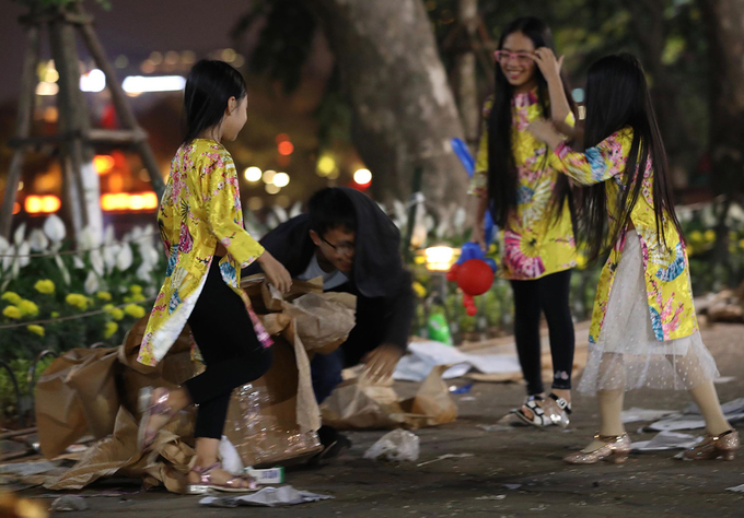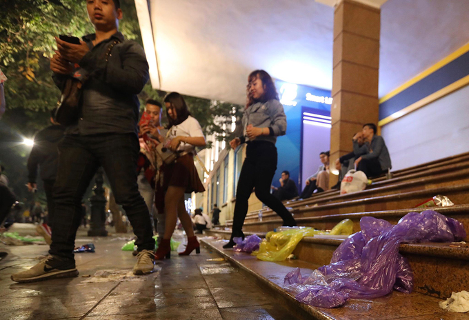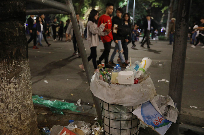 Rác ngập khu vực Hồ Gươm sau giao thừa. Người dân vẫn xả rác xuống đường mặc dù có nhiều thùng rác. Sau đêm giao thừa, đường phố Hà Nội sạch đẹp thường ngày đã như một "bãi rác" lộ thiên.