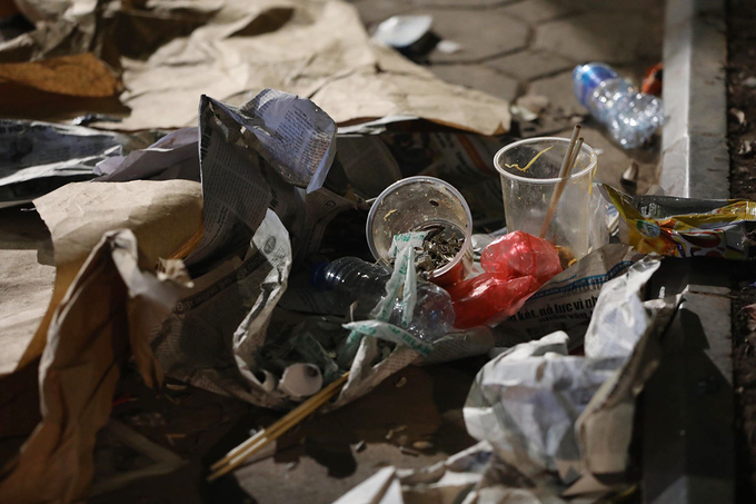 Khoảng 1h ngày 5/2 (mùng 1 Tết), sau thời khắc giao thừa người dân rời đi để lại lượng rác lớn gồm giấy và nylon trên phố.