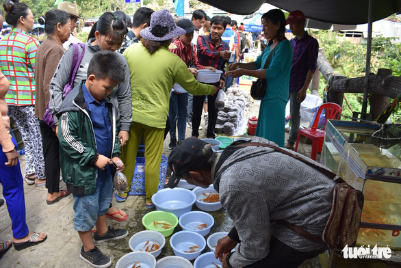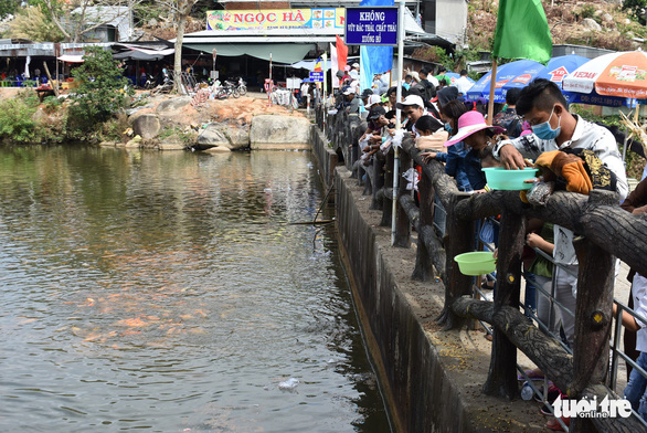 Nhiều du khách sau khi thả cá phóng sinh hoặc cho cá ăn đã... quăng luôn bịch nilông xuống lòng hồ - Ảnh: BỬU ĐẤU
