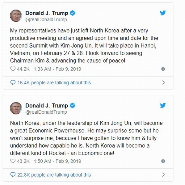 “My representatives have just left North Korea after a very productive meeting and an agreed upon time and date for the second Summit with Kim Jong-un. It will take place in Hanoi, Vietnam, on February 27 & 28,” Trump said on Twitter. “I look forward to seeing Chairman Kim & advancing the cause of peace!”