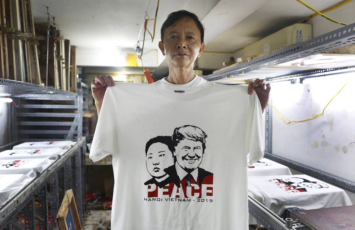 Cuối tháng này hội nghị thượng đỉnh Mỹ-Triều sẽ chính thức diễn ra tại HN. Nắm vững cơ hội này 1 xưởng in đã cho ra đời hàng loạt áo có hình Trump - Kim để bán. Hiện xưởng in này đang kiếm bộn tiền nhờ công việc này. Hai ngày nay, xưởng in thủ công trong căn nhà chưa đầy 20m2 trên mặt phố Hàng Bông (Hà Nội) của ông Trương Thanh Đức hoạt động tất bật hơn ngày thường, khi ông bắt đầu sản xuất những chiếc áo in hình Tổng thống Mỹ Donald Trump và Chủ tịch Triều Tiên Kim Jong Un. Ông dự tính mỗi ngày in 500 chiếc áo để bán nhân dịp Hội nghị thượng đỉnh Mỹ-Triều lần thứ 2 tổ chức tại Hà Nội.