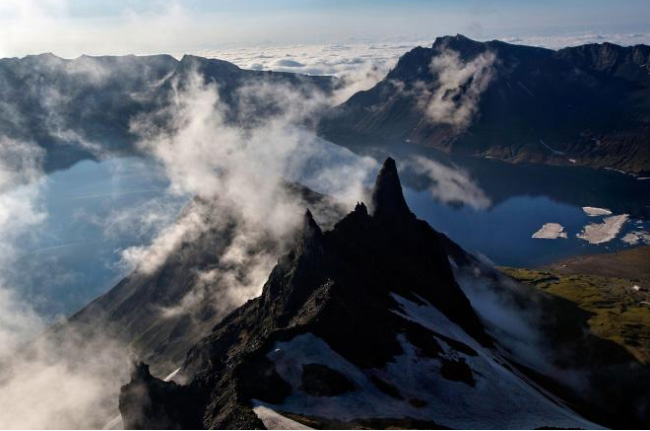 Hình ảnh ngọn núi lửa Paektu ở Triều Tiên với những đám mây trôi trên đỉnh núi Paektu. Nằm giữa các ngôi làng và những cây việt quất, ngọn núi lửa Paektu linh thiêng và đẹp đẽ đã rất nổi tiếng trong những năm gần đây, thúc đẩy nỗ lực quốc tế nghiên cứu về phần dưới của nó. Một thiên niên kỷ trước, núi Paektu đã bùng nổ với một cơn giận dữ cạnh tranh với những vụ phun trào lớn nhất trong lịch sử loài người được ghi lại, ném đá vỡ vụn và tro bụi xa tít tận Nhật Bản. Bất chấp sự bùng nổ dữ dội đó, Núi Paektu Giáp về cơ bản vẫn còn bí ẩn. Không ai biết liệu, hoặc khi nào, đỉnh cao 9.000 feet có thể phun trào trở lại.