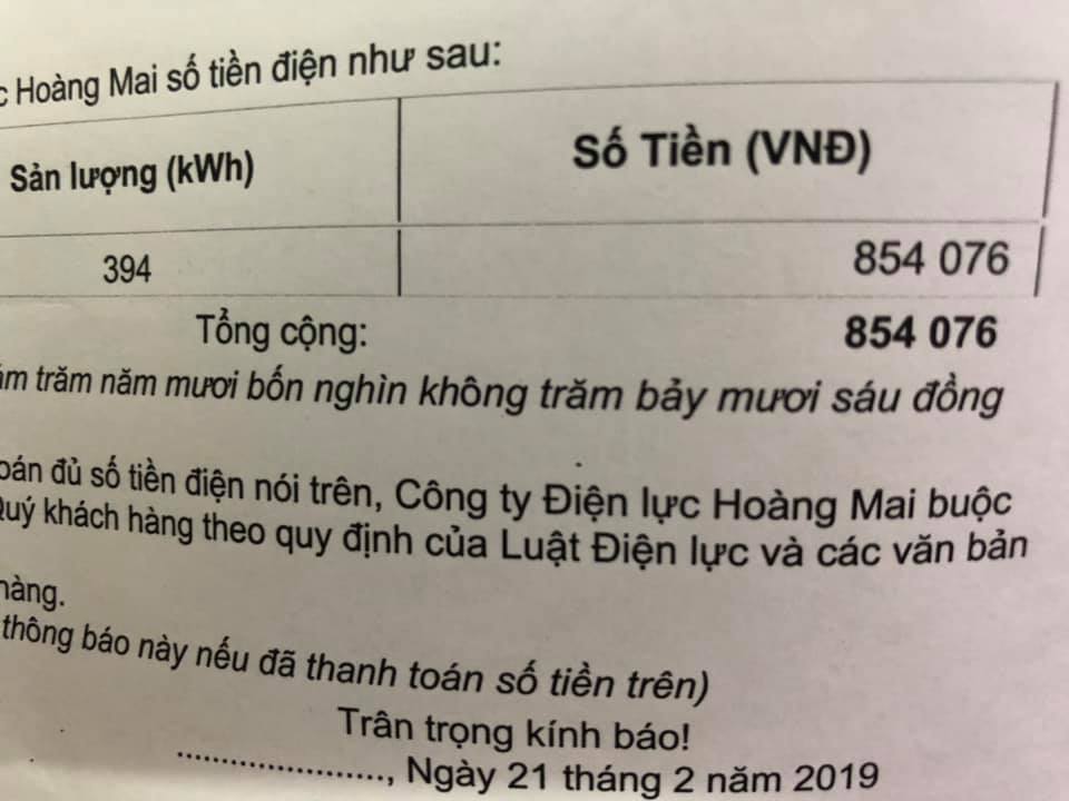 Trong những ngày về quê, gia đình tôi đã đóng cầu dao, không tiêu thụ điện nhưng vừa qua thấy Công ty Điện lực Hoàng Mai thông báo mới giật mình, khi thấy tiền điện tăng thêm gần 200.000 đồng so với tháng trước, lên hơn 600.000 đồng”.