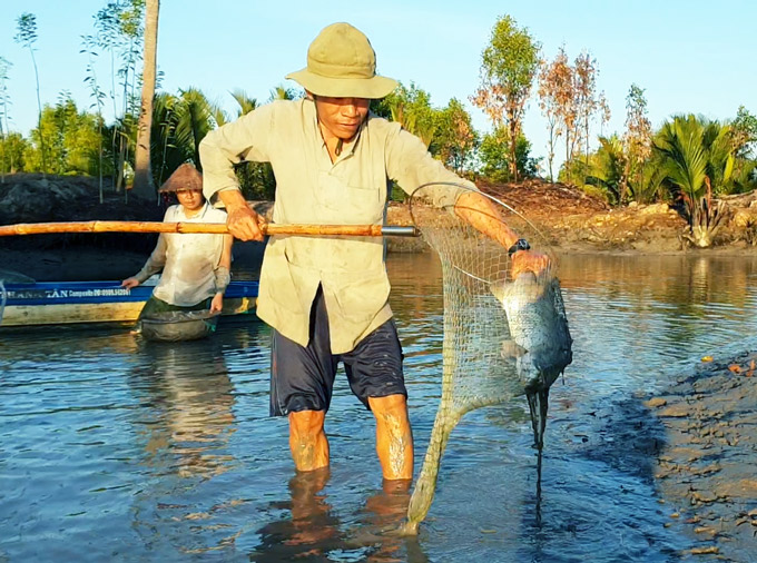 Với giá trị kinh tế cao, nhiều nông dân ở Cà Mau đã thả nuôi ghép cá chẽm trong vuông tôm. Thông thường, người dân sẽ sử dụng thuốc cá để bắt cá chẽm và các loài cá tạp khác trong vuông.