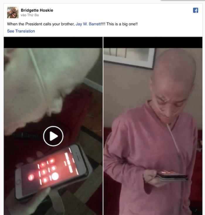 Chị Bridgette Hoskie chia sẻ trên Facebook đoạn video, ghi lại cuộc tṛ chuyện của người em trai Jay Barrett với Tổng thống Mỹ Donald Trump. (Ảnh chụp màn h́nh).